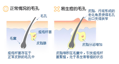 皮肤的表面有许多菌落存在,而其中痤疮棒状杆菌特别喜欢毛囊内的无氧环境,它们的存在使皮肤表面的脂肪分解。因此造成对人体的刺激,有些毒性物质也诱发发炎。进一步破坏毛囊和皮肤,产生痤疮。