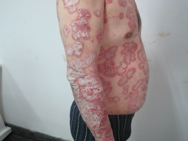 症状:以成人多见,往往发生于躯干、四肢伸侧也常受累及.皮损呈斑块、表面附有厚层银白色鳞屑.